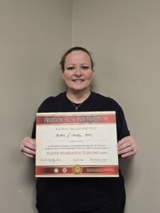 If you’re looking for massage therapy in Greensburg, Bobbie Schultz is the massage therapist to see. We’re delighted that she decided to pursue certification as a Master Myoskeletal Therapist (MMT). Achieving this certification, one of the highest standards for a massage professional, is not easy. It takes a burning desire to get results for your clients and a great deal of commitment. You can read a little bit about her journey below. We know you’ll be in great hands when you book an appointment with Bobbie. For massage therapy in Greensburg, contact Bobbie. The links are below.