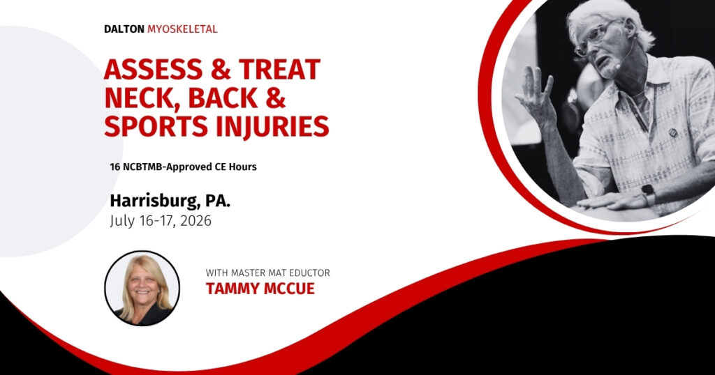 Dallas, TX April 14 – 16, 2026 Register Now Home DALLAS, TX APRIL 14-16, 2026 Myoskeletal Alignment Techniques® Clinical reasoning for neck & Back pain (24 CE / 3 Day Workshop) Clinical reasoning is essential in advancing your massage skills to the next level. Learn the importance of clinical reasoning and how to integrate this […]
