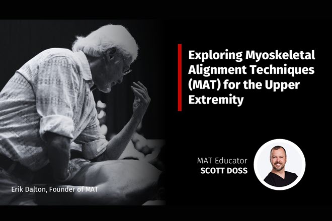 Join international educator Scott Doss on Tuesday, August 19th at 1pm ET (New York time) for an engaging exploration of upper extremity strategies drawn from the extensive Myoskeletal Alignment Techniques (MAT) system created by the legendary Erik Dalton. This special session combines thoughtful theory with hands-on techniques to help practitioners address some of the most common and complex upper body complaints, including shoulder impingement, rotator cuff tendinopathy, deltoid shear, lateral epicondylitis, and carpal tunnel syndrome.
